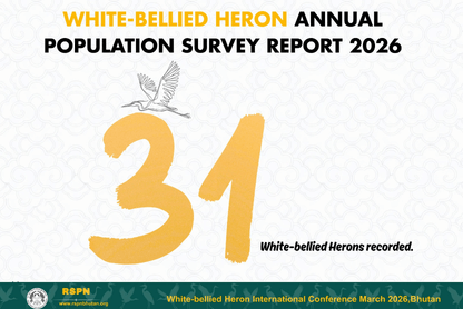 This yearโ€™s report marks a record-breaking achievement with a total of ๐Ÿฏ๐Ÿญ ๐—ช๐—ต๐—ถ๐˜๐—ฒ-๐—ฏ๐—ฒ๐—น๐—น๐—ถ๐—ฒ๐—ฑ ๐—›๐—ฒ๐—ฟ๐—ผ๐—ป๐˜€ in Bhutan, surpassing last yearโ€™s count of 29 and exceeding the highest recorded number of 30 individuals in Bhutan so far since 2003. The 31 individuals include observation of 26 individuals in the wild and 5 individuals currently being raised at the Conservation Breeding Centre. This year, the survey also observed 5 numbers of active nests of heron in Bhutan; the highest count of nests in Bhutan in recent years. Four nests are located within Punatshangchhu basin and one in Mangdechhu basin. The population survey is annually conducted by RSPN in collaboration with Department of Forest and Park Services and local communities. This year, the survey was carried out from 1-5 March engaging more than 100 surveyors.