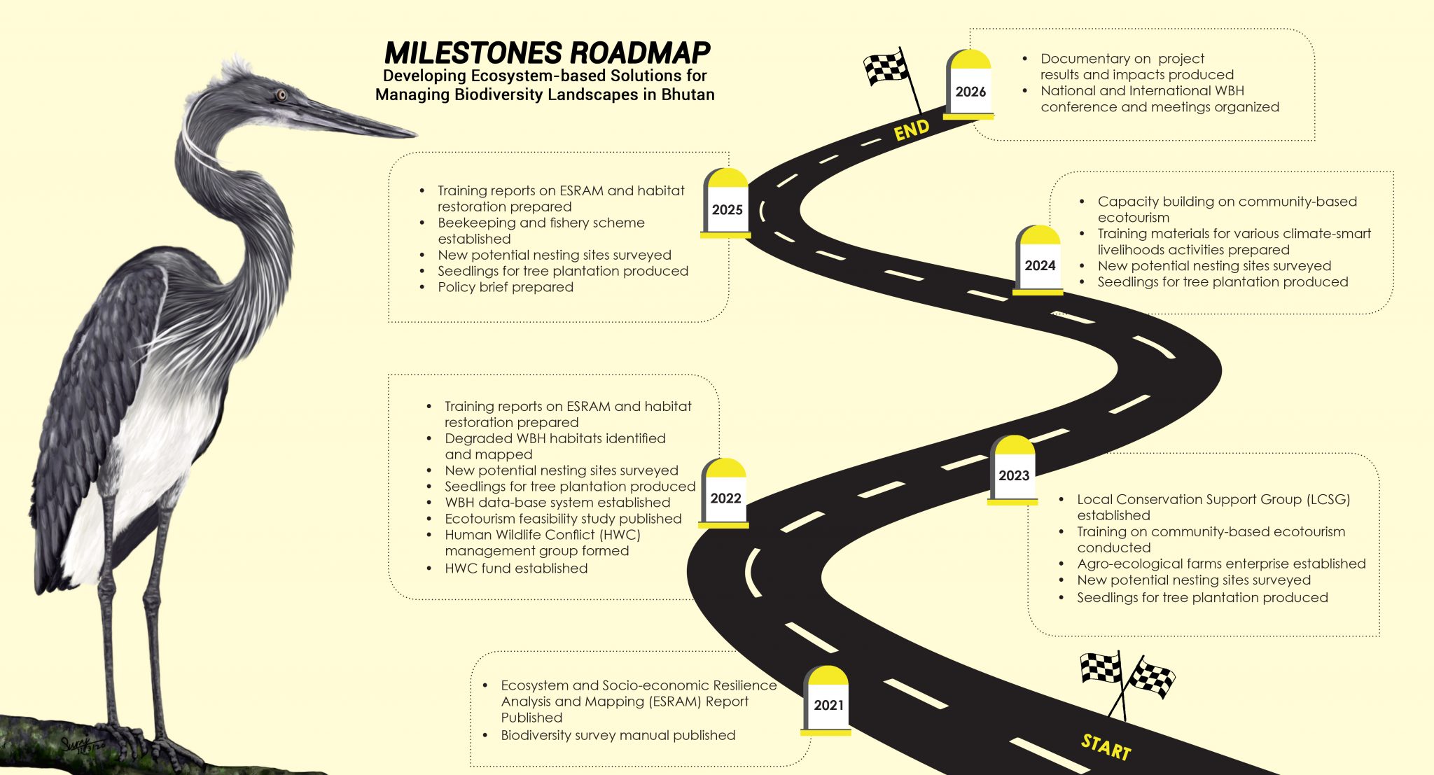 The objective of the project is to establish approaches and tools for protecting and managing the Critically Endangered White-bellied Heron (WBH) habitats along Punatsangchhu and Mangdechhu basins, central part of Bhutan. It is funded by the Federal Ministry for Environment, Nature Conservation and Nuclear Safety (BMU), Germany through International Climate Initiative (IKI) with co-funding from MAVA Foundation, Switzerland and the Royal Society for Protection of Nature (RSPN). The project is implemented in collaboration with the Royal Government of Bhutan and other stakeholders.